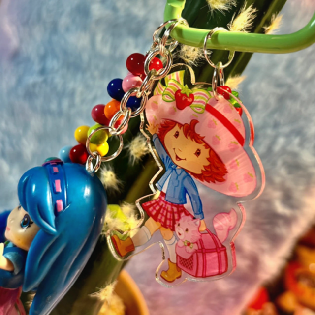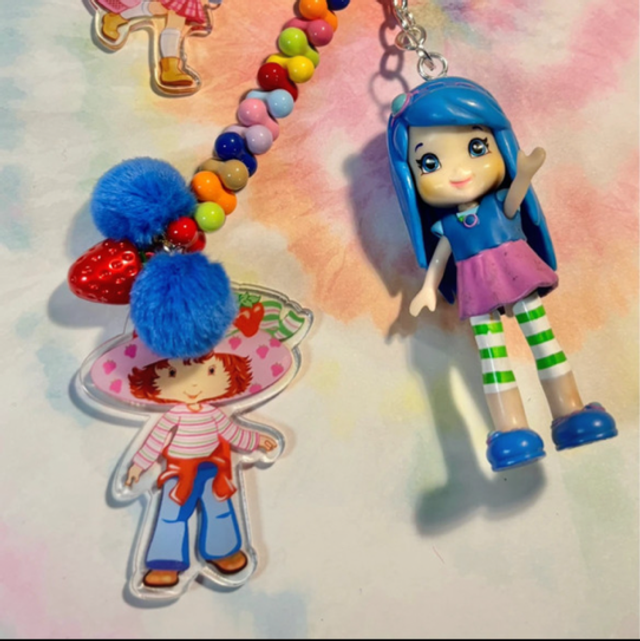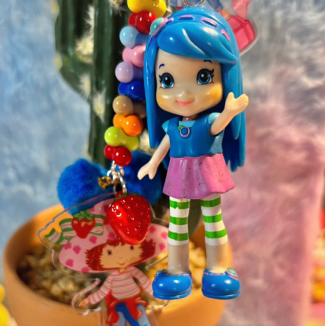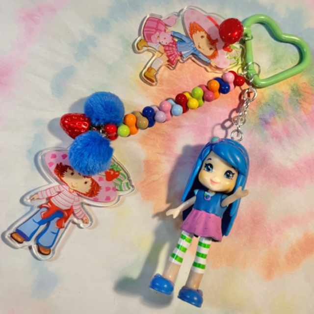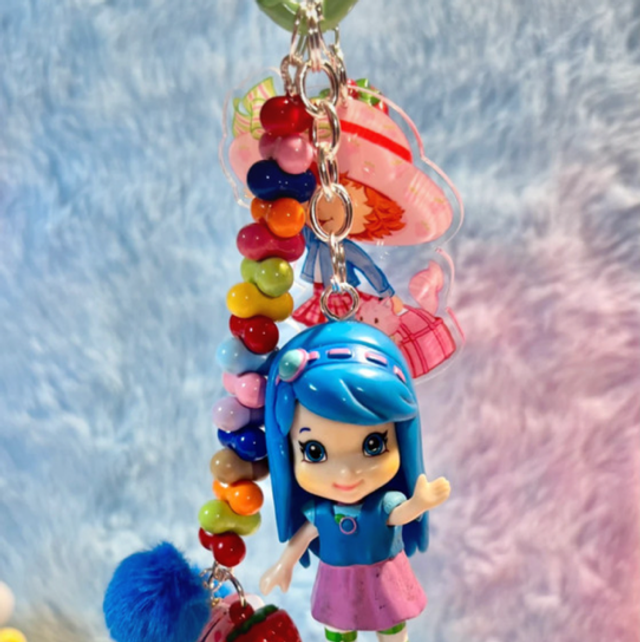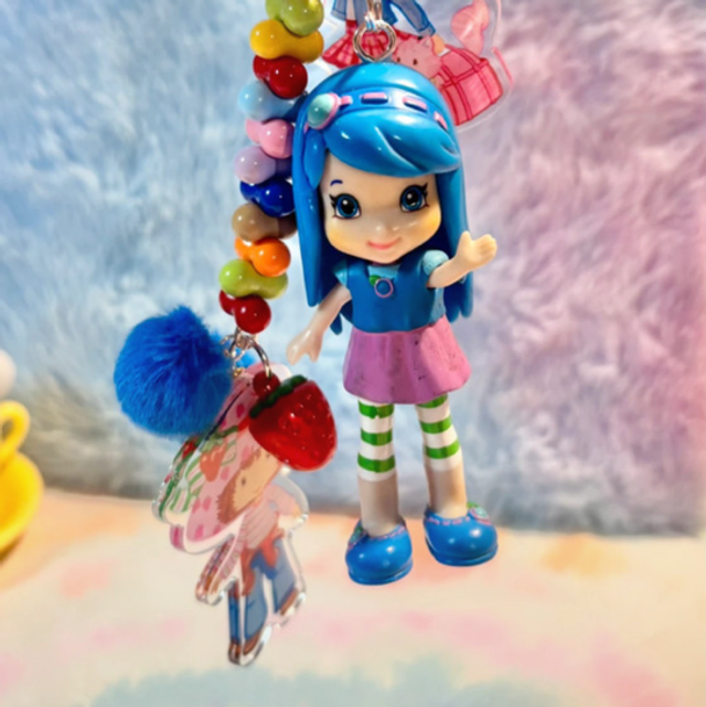 Berry cute! Blue Strawberry Shortcake inspired keychain with lovely focal figure, beading and matching acrylic details. Perfect key or bag charm.