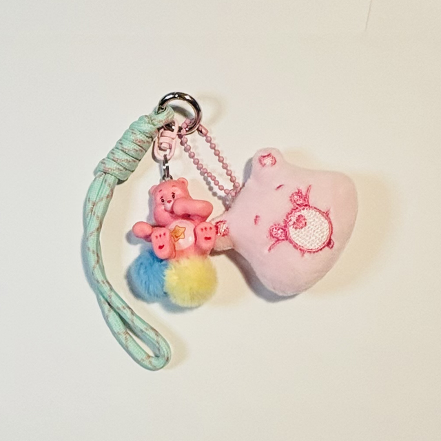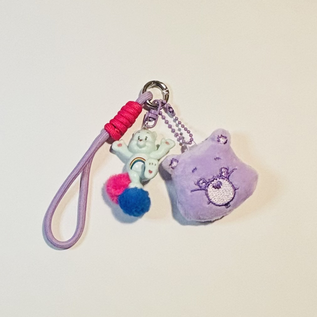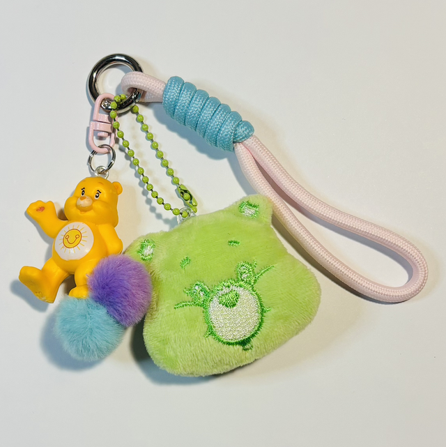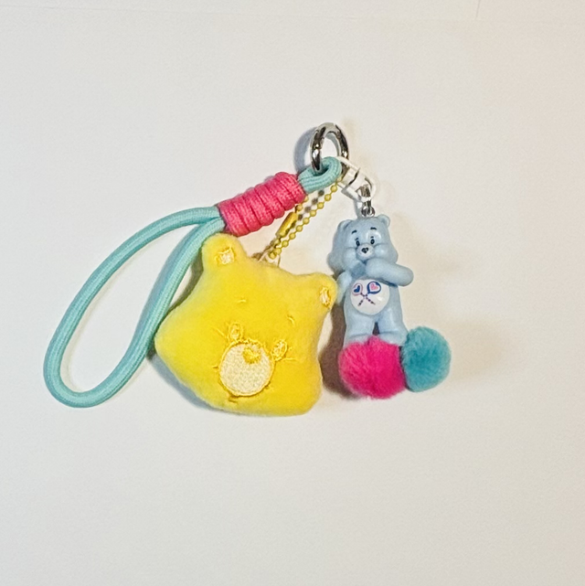 Cute Care Bear plush & figure keychain finished with a rope wristlet. 4 colour designs to choose from. Please choose by the colour of the bear face plush, green, pink, yellow or purple plush.
