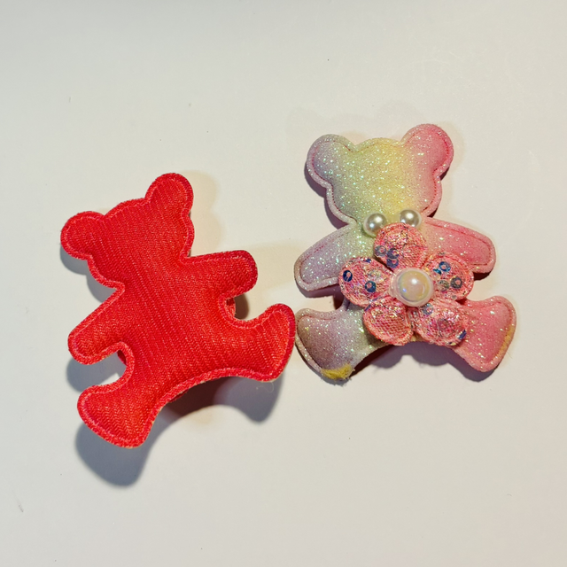 Cute glittery rainbow bear fabric embellishments with pearl detail, for crafting projects. 6 cm tall. 2 in a set.