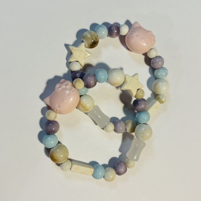 Cute elastic handmade bracelet ceramic pastel beads with Kitty focal bead.