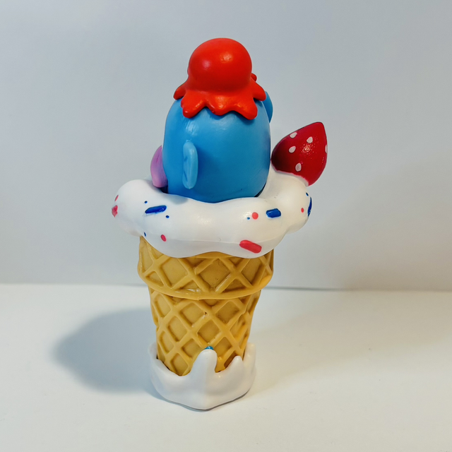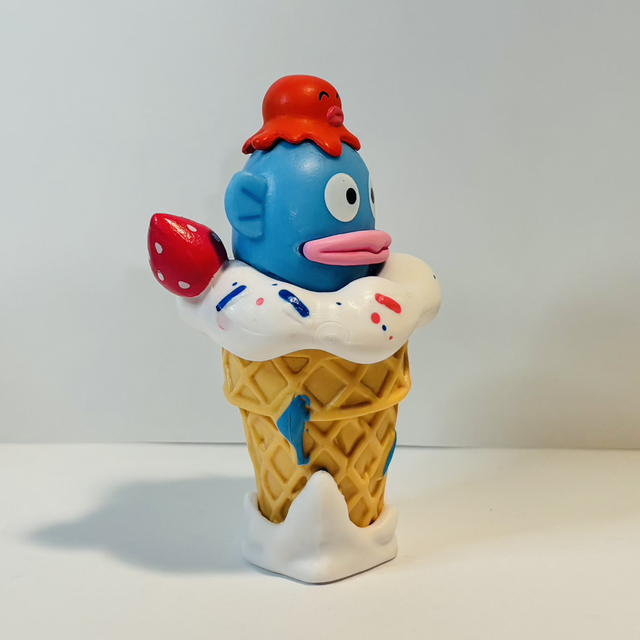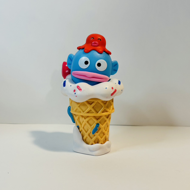 Funny Hangyodon! From the Hello Kitty family. He dreams of being a comedian and hero, enjoys hot pot and hot springs. Cute figure ornament, sitting in an ice cream cone with his closest companion octopus friend Sayuri! Stands 9cm tall and 5cm at the widest.