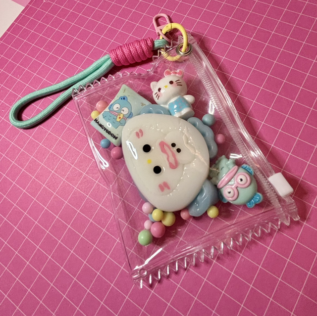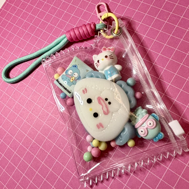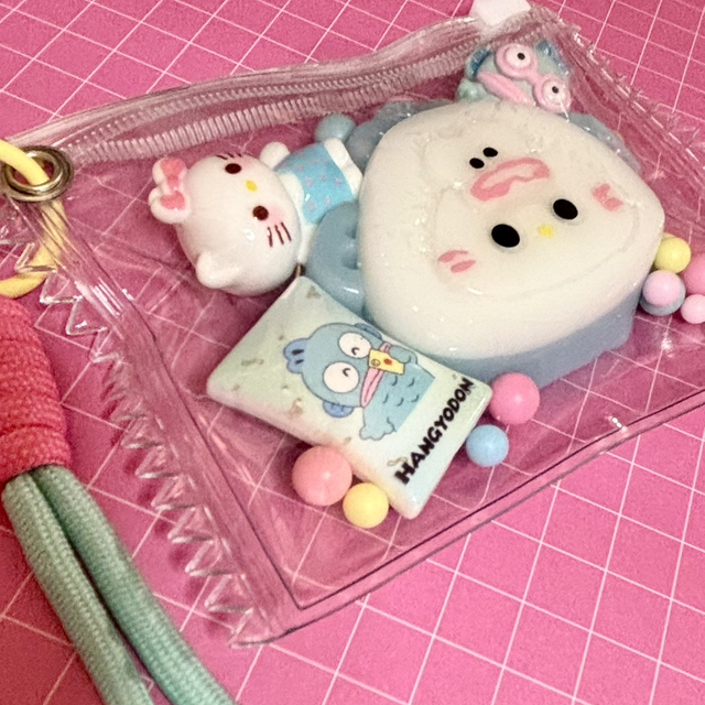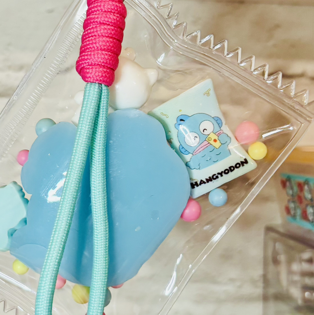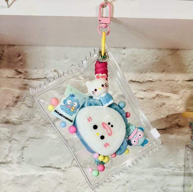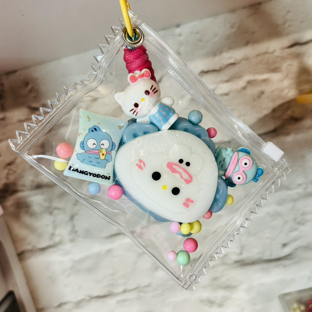 Lovely Hello Kitty Hangyodon squishy keychain with matching charms inside the PVC bag. Finished with a rope wristlet. Please see pictures for a more detailed visual description. Great to hang on your bag, keep at work to relieve stress by gently squeezing the squishy.