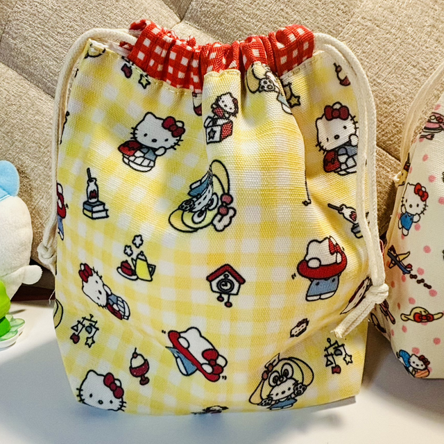 These handmade drawstring bags are very gorgeous! They are lined inside so can be used for toiletries. Also just a very cute bag to keep anything in! Comes in 2 Hello Kitty design fabrics, yellow gingham and a cream with pink polka dot. Measures approx 20 x 20cm.