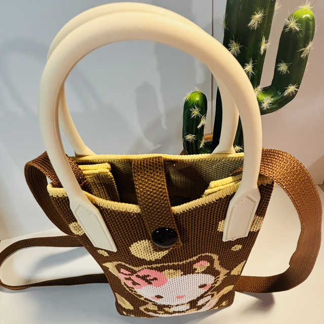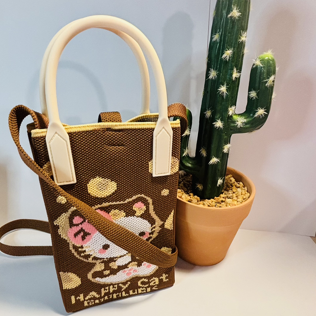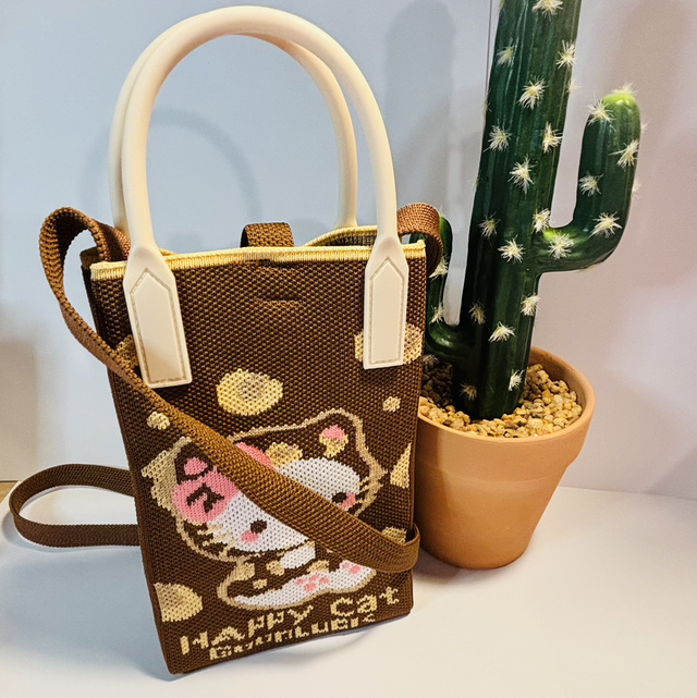 Hello Kitty themed cross body bag made with a thick stitch pattern detail fabric and silicone style handles. This bag will easily hold a phone, purse, make up etc., great to throw on for quick trips out or even a day shopping if you prefer a smaller bag. It's more roomy than it looks! and is secured at the top with a popper strap. Nice neutral colours so will go with most everyday outfits. Measures approx 27 x 11 x 6cm.