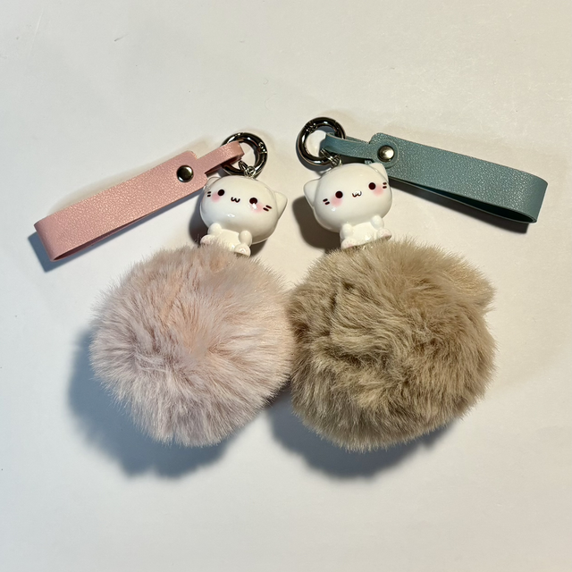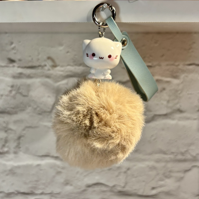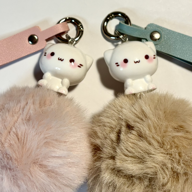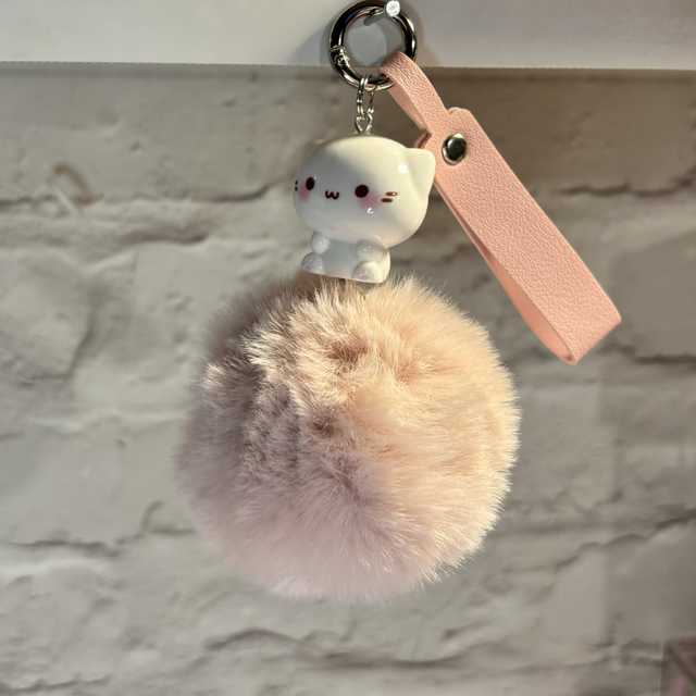Kawaii cat figure keychain with lovely fluffy pom pom and matching fob.