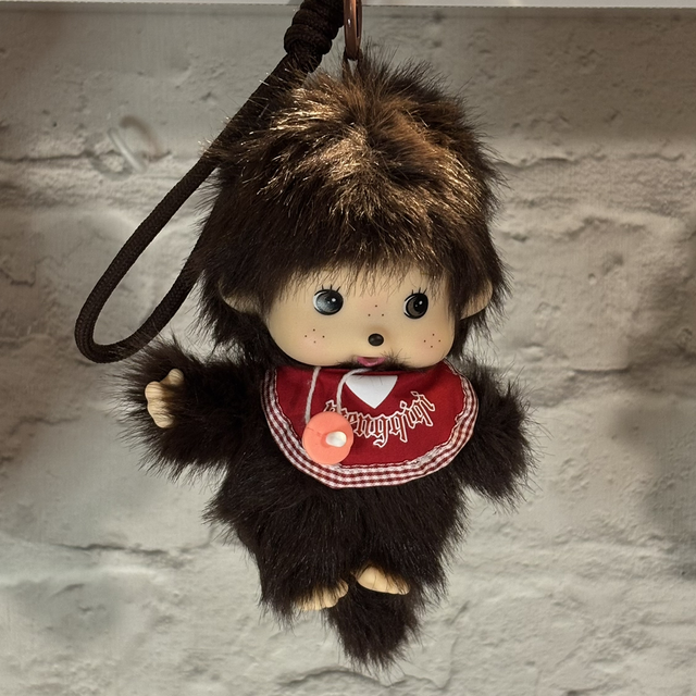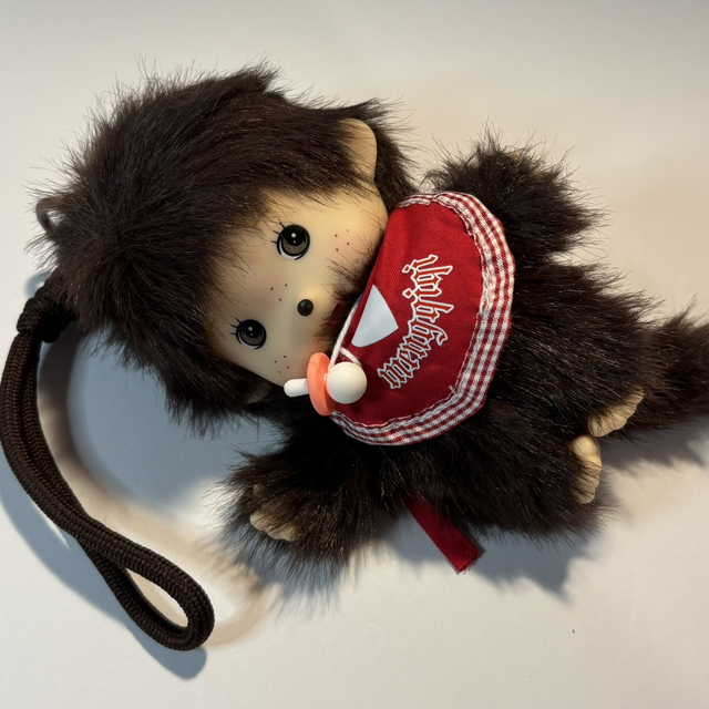 This Monchichi is original design and has a little red classic bib and comes with a pacifier! An added matching rope wristlet which is easily removable. Beautiful Monchichi plush. Perfect for all lovers of Monchichi to accessorize bags and/or use in the home to display or car as a decorative hanger. Cute & Happy, fun item. Would make a special gift or treat to make you smile!