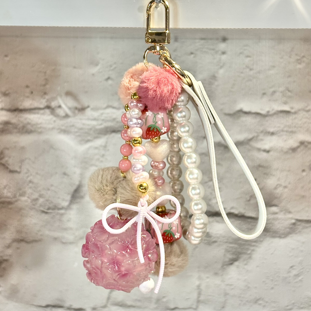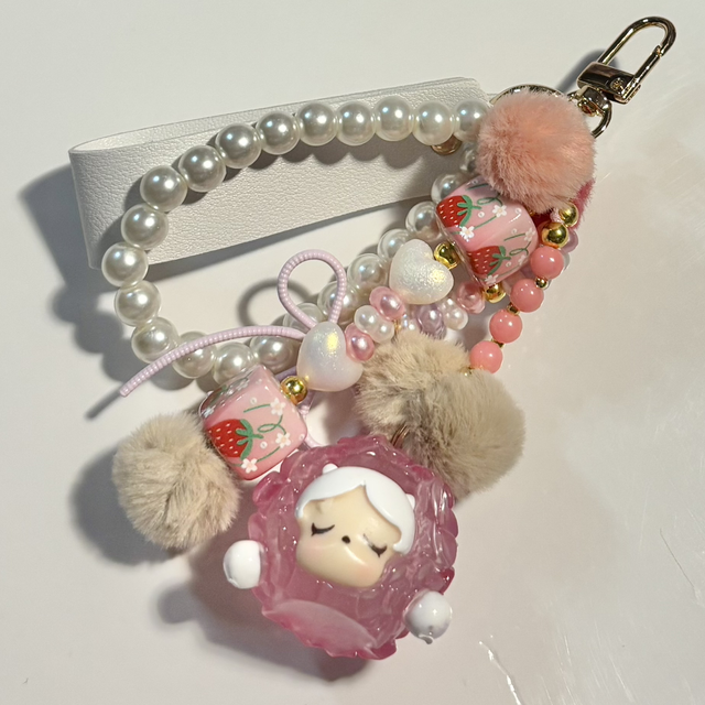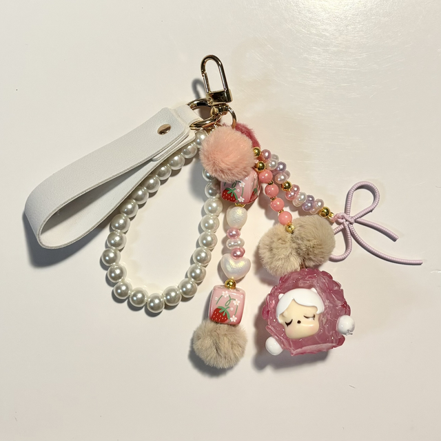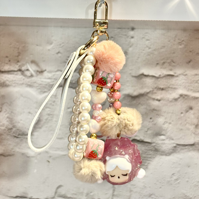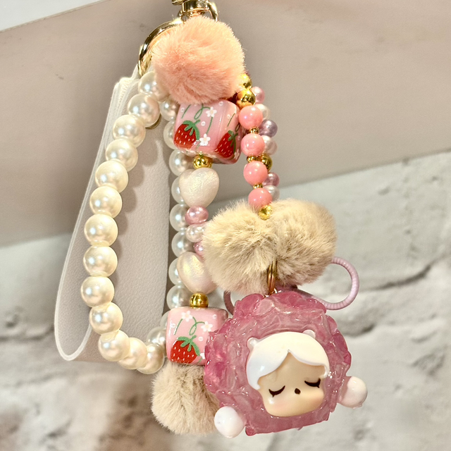 Lovely variety beaded pom pom detail keychain with sweet Skull Panda head focal charm.