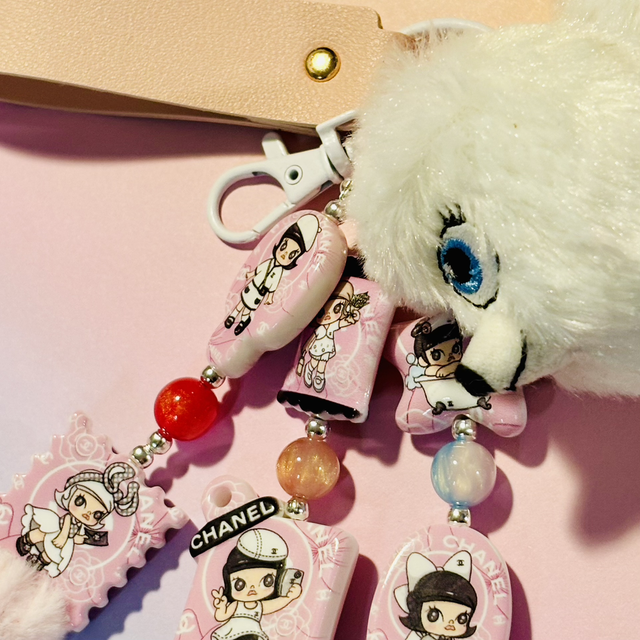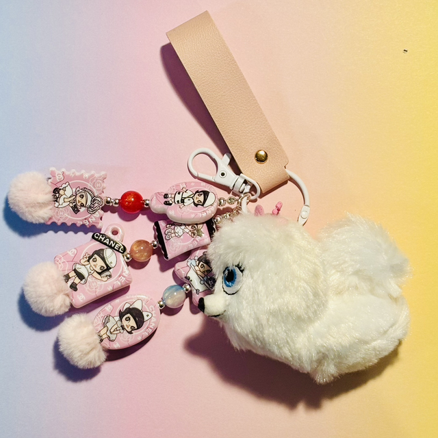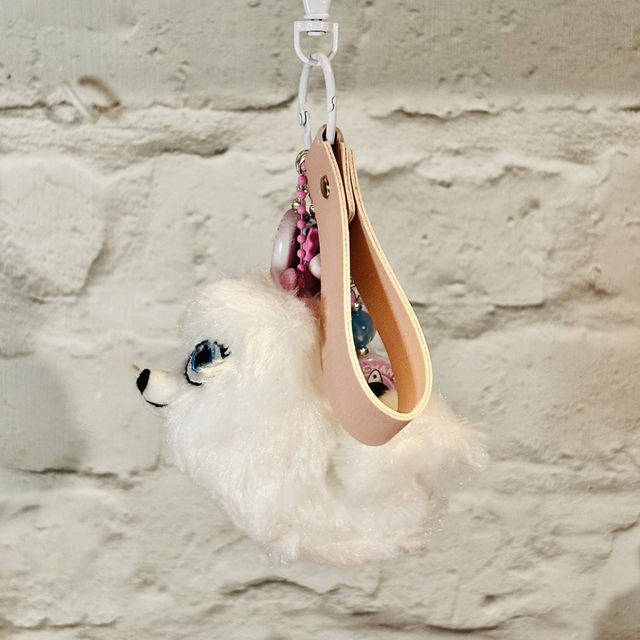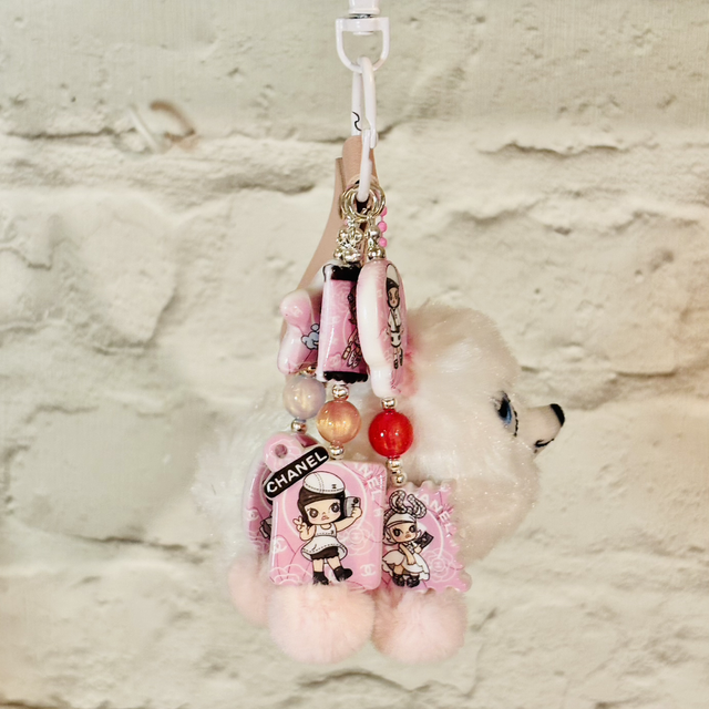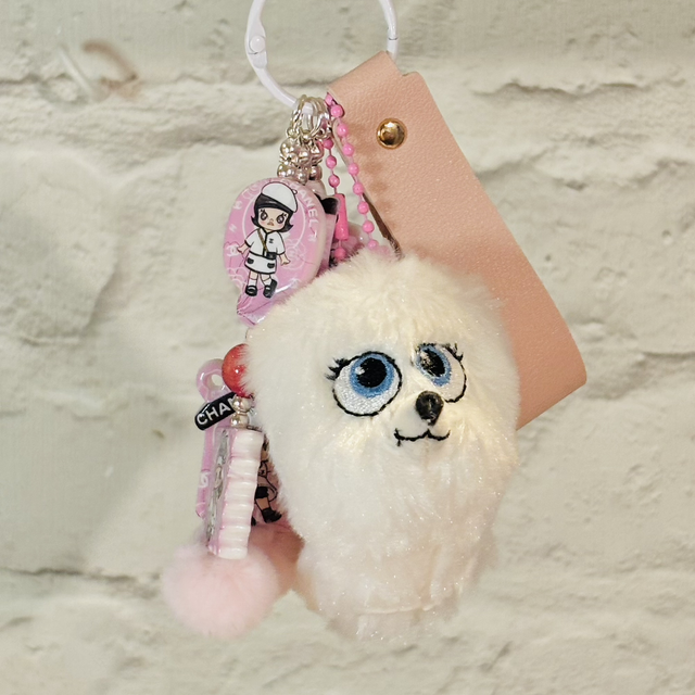 Super cute Gidget plush keychain pendant with added designer Molly pink beading detail which makes such a great combination! Making this keychain pendant a unique item! Will look fabulous hanging from any bag!