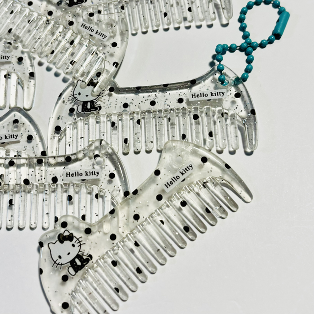 Lovely mini combs and useable! 6.6cm in width, can be added to keychain or other craft projects. Black polka dot Hello Kitty design and they have hole for you to attach.